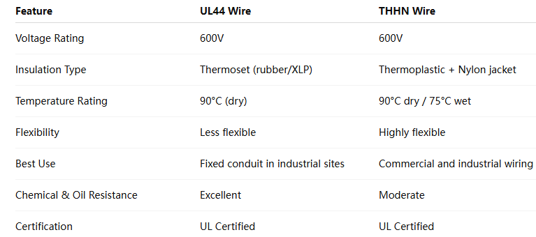 From the table, it’s clear that UL44 wires excel in harsh industrial environments, while THHN wires are better for general-purpose installations where flexibility and moisture resistance matter.